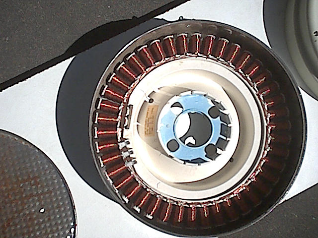 The stator on test was rewound with 4mm wire ( yellow insulation ). To increase the output power we had a new hub cast from aluminium.