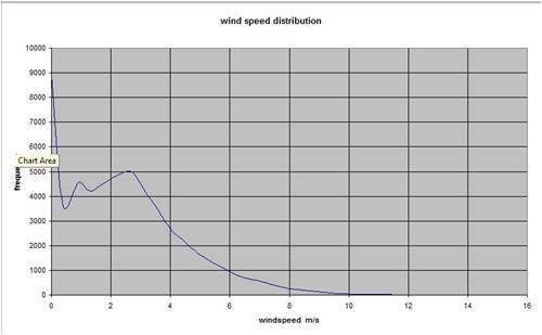 On the matter of the occurrunce of high winds. in the last year, my location which I would classify as OK only for wind, recorded only 1, 10min period in 55000 recorded [0.0018%] during the year of wind with an average of 15m/s, and only about 100, 10min periods in 55000 where the windspeed averaged over 10m/s. look at the tail on the graph above. Once you have the windspeed distribution, you can design the windmill for it. There is not much point in designing for the big numbers if they don't occur very often. At my location, wind gusts are approx twice the speed of the 10min ave speed, these would need to be considered in a design. Gordon. become more energy aware |