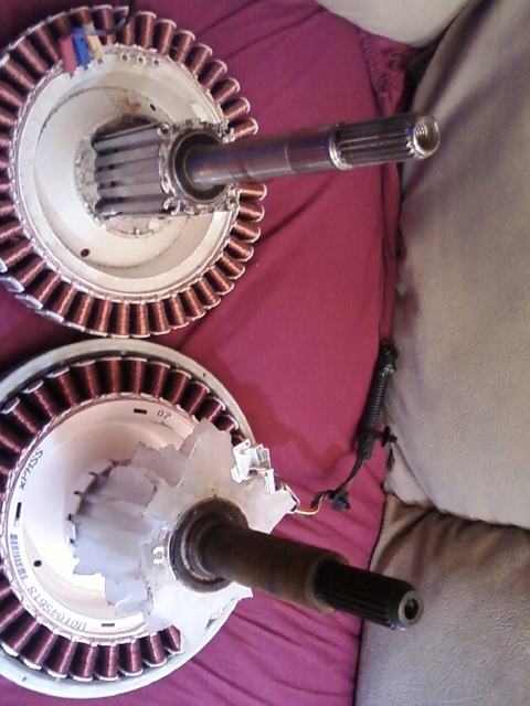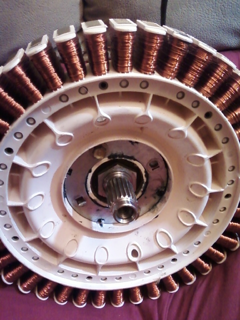 This pic shows more of the coils on the F&P but, mostly gives a good shot of the alluminum housing I kept from the washer tub. I cut this from the tub with a sawzall and then removed the bearings and melted the plastic off. You can see the center of the hub has had the tabs broken off. I did this to play with the idea of off setting this coil pack with another one on the other side of the shaft.