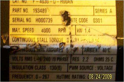 The winding resistance is 2.2 ohms. This is quite high and will limit the useful power on a 24V system. This was designed for 240VAC at 4000rpm. The wiring is rated for 5A continuous on the nameplate. Gordon. become more energy aware |