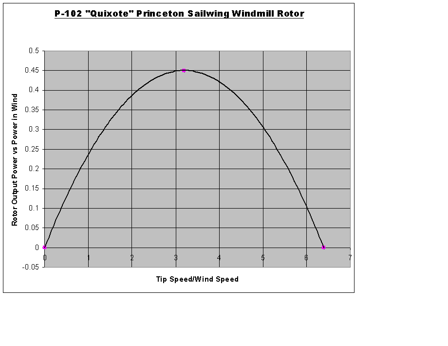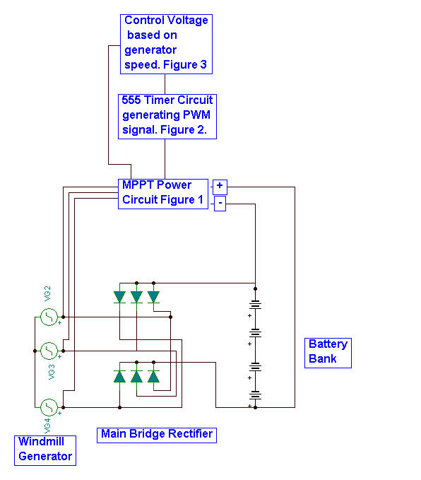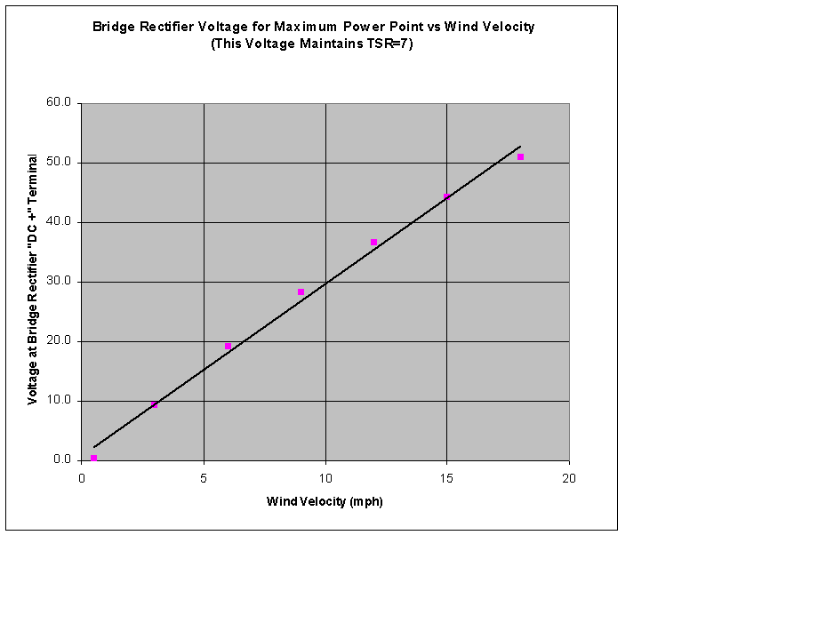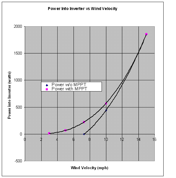 Windmill DIY Analog MPPT Circuit Design and Construction Purpose: I would like to share the design of my Windmill maximum power point tracking (MPPT) circuit in enough detail so someone with some electronics experience could make it for their windmill. I am pleased with the performance, so far. Here is a plot of performance data with and without MPPT: Shown are two plots; one with mppt, the other without. Notice the increase in power delivered to the inverter with mppt. This is especially significant for South Central PA with average wind velocities less than 8 mph. Background: The design requirements that I imposed on this circuit are listed below: 1. The circuit should operate in parallel with the main rectifier bank. 2. The circuit should load the windmill generator so the blades operate near their design tip speed ratio (TSR) for wind velocities between 3 miles per hour (mph) up to the design point wind velocity where the blade TSR naturally occurs. This design point velocity for my 20 foot diameter windmill and generator (shown here: http://www.fieldlines.com/story/2009/3/2/171331/4786) is about 18 mph. 3. The circuit should cut in at wind velocities approaching 3 mph and cut out at wind velocities exceeding the design point (18 mph). This is done to avoid overloading circuit components. Besides, there is little energy available at wind speeds under 3 mph. At wind speeds over 18 mph, I am starting to shed some power through furling and stall and don’t need MPPT. 4. Use analog components that are readily available at Radio Shack or on eBay. Approach: There are three basic sub circuits that make up the MPPT system. The block diagram for the MPPT circuits is shown below: These sub circuits, are: 1. Power shown in Figure 1.This circuit takes power from the generator and transfers it to the battery bank. It receives a pulse width modulated (PWM) signal from a 555 timer circuit that is used to control the voltage at the bridge rectifier “DC+” terminal. Controlling this voltage sets the power transferred to the battery and regulates the load on the generator to assure MPPT. 2. The 555 timer circuit is shown in Figure 2. It generates the PWM signal as a function of a voltage proportional to generator speed. 3. The circuit that generates the pulse width control voltage proportional to generator speed is shown in Figure 3. This voltage is also tailored to cause cut in and cut out the MPPT system. The details of these circuits are shown, below: 1. Power (Figure 1) The power portion of the circuit is shown here: It is a relatively standard boost converter design whose purpose is to load the generator so it operates at the design TSR for a wide range of wind speeds. This is achieved by controlling the DC “+” voltage at the bridge rectifier. 2. PWM Circuit (Figure 2) The PWM circuit uses a 555 timer circuit set up to create a 10khz pulse modulated with a voltage signal ranging from about 4 volts (0% pulse width) to about 8 volts (100% pulse width). 3. Control Voltage (Figure 3) The pulse width control voltage portion of the circuit is the brains of the MPPT system. The circuit is shown below: D: Performance: One question that could be asked, is: “How does this circuit provide MPPT through out the selected wind speed range?” The following is my answer: Optimally loaded wind turbines run at about half their unloaded rpm at their design TSR. This can be seen in measured data such as that provided by Princeton University for their sail wing design. Princeton’s data are shown below: You can see that peak power occurs at roughly one half the unloaded TSR; For example, my 20’ diameter windmill was designed for a TSR=7. Unloaded, it will run at a TSR approximately = to 14. Our windmills charging a battery bank without MPPT will operate at the design TSR at only one wind velocity. For example, my 20 foot diameter windmill starts making power (“cuts in”) at 7.3 mph with a TSR ~14. Its design TSR is 7. As the wind velocity increases, the operating TSR reduces from 14 to 7 as the wind velocity increases from 7.3 to 18 mph. Above 18 mph, the TSR moves from 7 toward 0. This all occurs with a battery voltage ~ 52 volts. There are ways to load the wind turbine so it operates at its design TSR for all wind speeds above cut-in. One way involves changing the “apparent” battery voltage in proportion to wind velocity. The boost converter shown in Figure 1 does this by controlling the voltage (Vr) at the “DC+” terminal of the bridge rectifier. The output of the boost converter is clamped at the battery voltage. Vr is related to the design TSR, as shown in the following equation: Vr = generator voltage * 3^^.5 at design TSR - I * R drop in generator and line - drop across bridge rectifier I solved this equation for my windmill and have plotted the results below: (Don’t worry; you won’t have to calculate this for yours, if you don’t want to. There is a simpler way.) I’m showing this for those interested in the physics. Notice the almost linear relationship between Vr and wind velocity. This occurs because the IR voltage drop through the generator and line resistances are small compared to generator voltage. This simplifies the controls. It also, makes Vr proportional to generator speed, especially at low wind velocities where generator current is low. The MPPT circuit potentiometers are adjusted to achieve the above Vr, as shown in the System Alignment section, below. In effect, it uses the Boost circuit to provide an apparent battery voltage as a function of wind velocity. The 555 timer circuit of Figure 2 provides a PWM signal to the MOSFET gates in Figure 1. The pulse duty cycle varies in a way to provide Vr, as a function of wind velocity. The relationship that works for my 20’ is shown below: This relationship can be achieved by analysis or by using the system alignment procedure covered below. The system alignment procedure is a better choice than analyses because it account