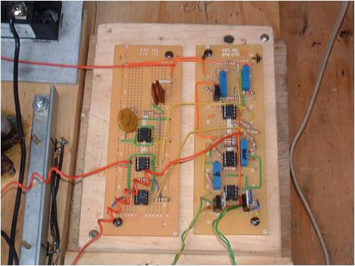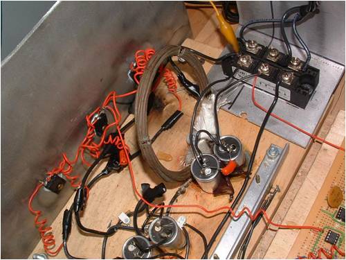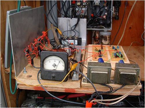 davef, Thanks for your helpful remarks. I'll check out RFSim99. Steve, Here are the circuit photos you requested. The first one shows the complete bread board, as follows: The +/- 12 volt power supply is shown in the front right; Mosfets and their heat sink plate (8"x12") are shown on the extreme left; bridge rectifier, back left, circuit boards, back right. The DC ammeter is reading about 14 amps. The coil is shown here: As stated in Figure 1, the coil is made from two parallel strands of 14 awg magnet wire, 10 turns wound into a 4" diameter coil potted in JB Weld. The circuit boards are shown here: The next step is to package the components in an enclosure and mount it on the wall of the control shack. Blessings and peace. Bob Shaubach BobS |