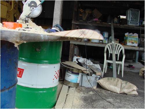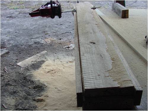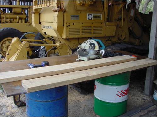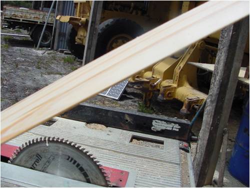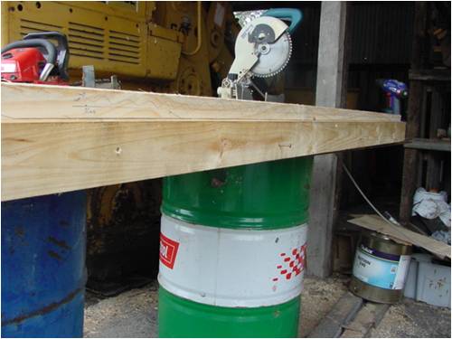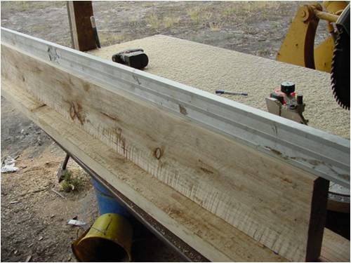 Note, with regards to measurement.... not many people want 4m of blade, so you will have to work out the measurements for your blade size anyway, but you should get the gist of it. First.... we get the essentials. A saw, chainsaw, chunk of forest, the power planer and the grinder with flapdisk (this will sort of sand resin soaked wood) and other assorted knick knacs... like a tape measure perhaps.... Most other folk will buy properly dried, dressed timber, and select the best at the shop without knots.... I got a chap on the other side of the island to hack some 8x2 pine with instructions to try and get reasonably seasoned knot free stuff.. you don't always get what you ask for over here, but it is wood.... the similarities end there. Any way, dock the end square: Make at least both of the edges clean and straight... we need to draw on them to make the jigs, and one side will be the leading edge.... so straight is nice. We need to have made our blade modifications by bolting on two slides to the blade like these: I use another 8x2 undressed... so it is slightly wider than the dressed one to use as a base plate to build the jig on. Grab some straight 3x1" ... mine was from an old packing crate, so I had to true it up first with the planer... it must be straight on the top. It will be screwed to the side of the base plate 8x2 such that it will leave a gap to the top of the blade blank 8x2 that is the equivalent to the cut depth you have made the slides on the blade for... plus how much meat you want to cut off.. It helps to do a dummy cut on some spare 8x2 to establish this measurement... Note the base board, the blade timber, and the side jig timber: Mine was about 8mm. This means that where ever the side timber is, the blade will cut 8mm above this. IMPORTANT!.............................................. Your chainsaw may be a bit ratty like mine with an old cutter bar and chain. With this in mind, you may do well to leave 2-3mm more meat behind than the proper figures suggest....Mine ... well you can move the chain teeth about 3mm side to side.. so 8mm + 3mm safety=11mm above the cut line..... keep this in mind for the remainder of the story. It doesn't look it, but the line is the same all the way, so the blade will just graze the 8x2 on this side.. and yes it's raining yippee!!.... Hee hee... just graze... not really. In my case, the wood is rough cut and not straight... so I will be gnawing into the face a few extra mm to get a true straight /flat face... ie I can't rely on the wood to be true.... especially three times in a row. Some will be 52mm, some 48mm and some 50mm. So I will be removing more than is traditional for the face. Normally the leading edge will be the top corner edge of the timber. Now for the other sides timber to guide the slide on the chain saw. Here, we guess how much angle we want. I wanted the tip to drop across the 8" by about 10mm. I don't know how many degrees that is, nor do I care, but it felt about right. I hadn't really decided on the tip width yet