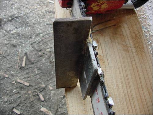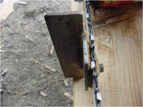 hi Oz had to think about this .....actually its more to do with the roller bearing at the base of the bar when the saw cuts it tries to pull away from me , if i was holding the saw normally i,d have the leverage to steady it ...usual chainsaw cutting ...using a handle you kind of lose this control the bearing though takes this load on so the saw is more stable , butted up to jig as it cuts ....i suppose this is really what allows the use of a handle .....(you dont have to concentrate on holding the saw steady when you get into the thicker root)... just push down and foreward now that i,m thinking about it ,the handle and bearing work together ...well at least on mine the difference i suppose is .. when i tried the chainsawing first i was never sure if the outer skid was tight on the jig or going for a little sponsored walk if i hit a knot (this was down to my saw handling ).....this way i,m sure , big difference for me the ripping chain does leave a better finish Oz ,it seems better suited to the cut but isn't necessarily any faster than regular chain (this is a bit immaterial as the cut only takes a minute or two anyway) ..the big difference on my saw was moving up to a 3/8 chain , it seems more stable during cutting (even with the chain slackened a little)..this could be due to the ripping chain also being more stable during the cut , ps...jarbar putting the handle on at a right angle is more natural to hold so probabely safer , either way you have a lot of control on the foreward skid ..it should also be easy to incorporate a proper guard around this area ...i like the ideas for protection putting a slip guard around the handle is essential which i,ll do before i use it again Pete i,m still using a file to sharpen but find the only way i can sharpen best with it is to take of the chain altogether and hold the teeth in a small vice ..the file seems to bite better for me this way...the diamond sharpener sounds interesting niall |