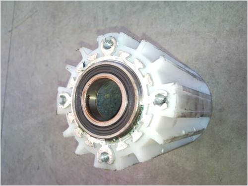 Connected 4 12v car batteries in line and got a readout of 13 amps @65 volts = 845W. I...was...happy. It had more to offer but the belts were slipping on my test bench, but would have been interseting to see just how much it can actually put out. Next was to mount the two stators on to the shaft.the first one (back side) in the usual manner ....just screw it on!! .The front rotor I machined so it snuggly fitted onto the shaft. similar to Phills dual setup. I then cut away some of the webbing