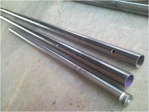 Then tapered the ends of the 22mm dia, 680 mm long solid bar as suggested. The other end I machined a groove for the ubolt to locate to prevent the blade from coming adrift. Drilled 4 holes for plug welding into the 25 mm, 1500mm long od tube, the last hole being 100mm from the end of the solid bar. .