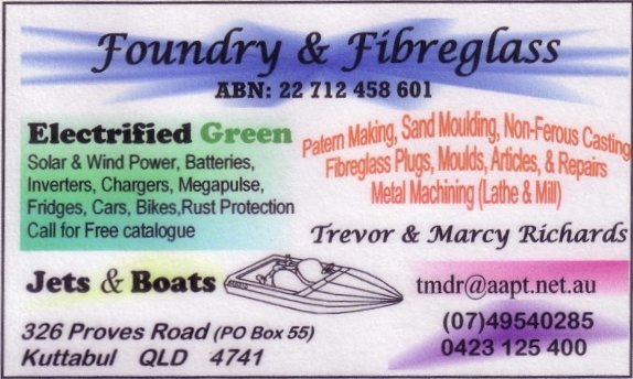 I had a talk to Trev tonight. I said there would be interrest in his blade hubs, and we also discussed the possibility of a replacement aluminium magnet hub. The hub would be a straight swap for the plastic unit, just add a steel backing band and neo magnets. This is Trev's business card, drop him a email.... Glenn The best time to plant a tree was twenty years ago, the second best time is right now. JAQ |