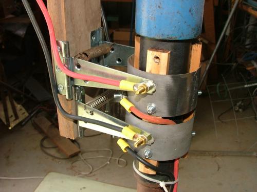 I have 2 versions of the brush holders. The first one uses 2 layers of steel strap ( used for packing, its very springy ). Each slip ring has two brass screws on opposite sides to ensure a good contact. Power it connected at the brass screw, I didnt want to use the strap to carry current.