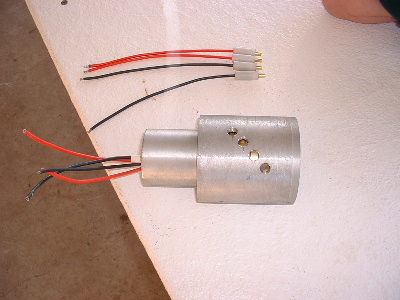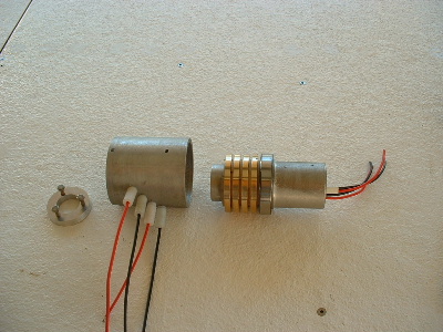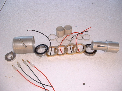 These photo's are of the inside of my slip ring setup. The 4 pole is what I use on my own double F&P White Pointer. The standard White Pointer Kit only has 2 slip rings. Basicly it is bronze rings and bronze brushes. The rings are seperated by PVC pipe and the brush holders are Nylon but could be made from any plastic, just drilled plastic rod and treaded to screw into the outer aluminium casing. The only thing you don't see is the springs to keep brush tension on the ring. The springs are inside the brush holders.