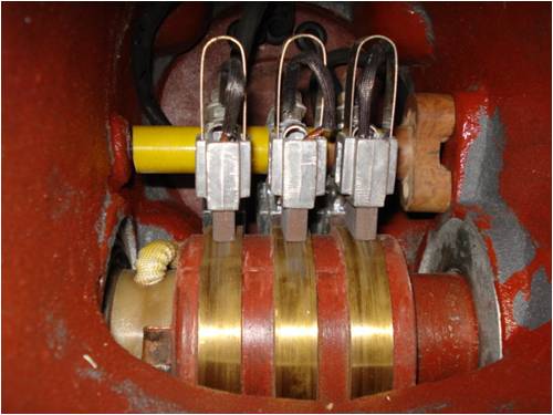 Next came the brushes,,scrounged from vacumn cleaners and stff like that Mounted 2 per ring and insulated them from the steelwork..