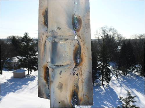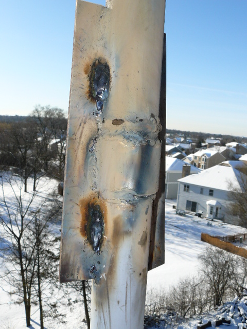 My Christmas present came early this year!! This is what I get for not using a solid mast or and not welding the coupling to he pipes. If I am not mistaken looks like the coupling is cracked. I am Dam lucky she's still on top of the mast and not on the ground.