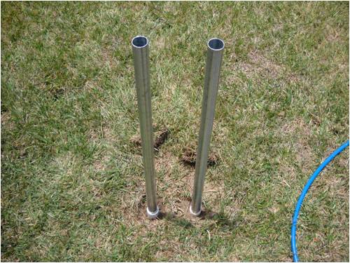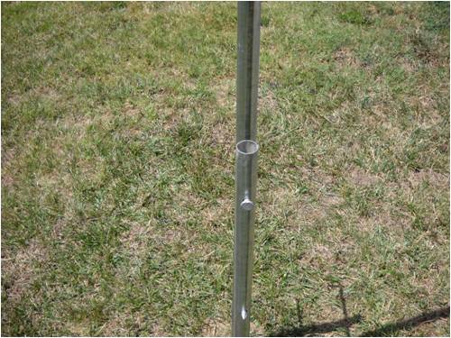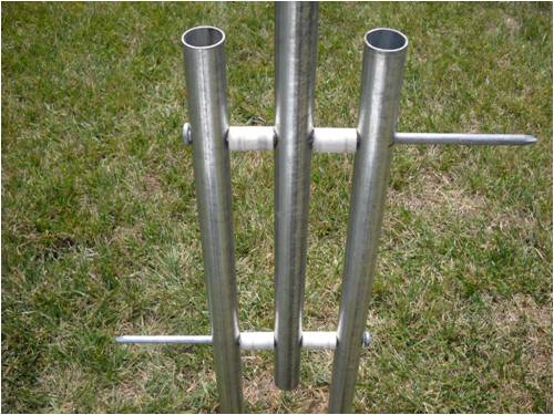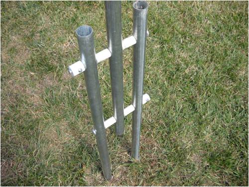 The tower (center pole) as well as the two that insert into the PVC water pipe jetted into the ground are "top rail" cyclone fence sections (10' 6" each) purchased at Home Depot in the fence-building-materials section for about $9 each. Truthfully, I didn't measure them. I snagged a piece of PVC pipe from the plumbing section and made sure the fence rail slipped easily inside the PVC. That's the only measuring I did.