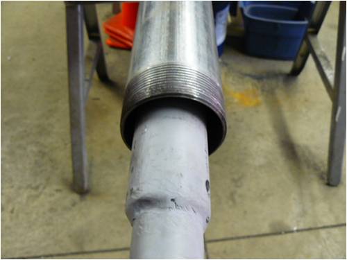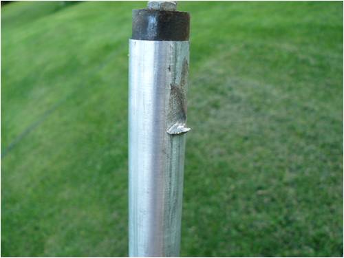 Thanks guys for your comments and concerns. Gordon Yes, this is the F&P modeled after yours. I think you have it right, run away mill. Karl Thanks for the heads up about Phills hardware. She will fly again I can promise you that. To all. After much thought and some investigation work this is what I believe happened. The mill ran away with the very high winds, the brakes just weren’t strong enough to keep it at safe RPM. The blades spinning at God only knows RPM bowed enough to smack the mast. I would like to believe that she would have survived the heavy winds if not for blade contact. The photo with the mast on the bench (9th photo from the top) showing where I made an earlier splint repair of the coupling shows the contact area. You can see the (right)metal splint is bent at the bottom right and the entire area has the white markings of PVC. The last photo shows the cut in the solid aluminum rod where she hit the metal splint. I do believe that the energy released from the hit was absorbed by the lower mast mount area and she came down. I am happy to say that the alternator, hub plate, rod mounts and yaw came out in good condition. I got lucky with the tail still intact. One cannot proceed with repairs and up grades if one does not know what went wrong. 1. First and foremost up grade braking to a system that will, with out a doubt stop it no matter what. 2. Lack of clearance blades to mast. 3. Underestimated the amount of blade flex. 4. The mill, and mast should have NEVER came down regardless of winds or blade contact, mast up grades are in order. I know I can have her up and flying again soon but until I get a firm grip on a full stop mode she will stay on the ground, hummm that could take awhile.