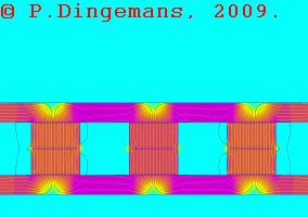 Eg, for round magnets 2" x 1/2 inch thick, best air gap will be about 3/4", and so magnet side by side can be as close as 3/4" for low leakage. Here 1/2 a magnet width would have been 1", so we can close it up a bit more than the general rule would have us believe IF we need to..... but winding window is better if left at 1" at least....