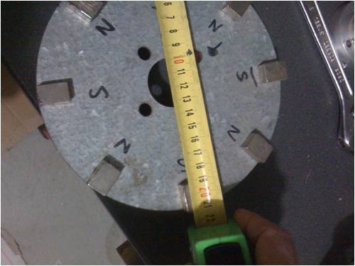 dazler Okay, lets get down to brass tacks. What you need to do is start over and go step by step to get some real results. For starters, here are some "rules" (read that guidelines): Measure your magnets' thickness. Double that and multiply by 75% (0.75). The result is your "ideal" air gap. From the picture yours looks kind of large (like twice as large as it might should be!). Next, wind your coils to more match the shape of your magnets. Round will work, but the more it appears to take the shape of a "flimish" (spiral, which almost fills the entire area), the more "cancellation" will occur and you'll wind up with next to nothing for voltage. Yes, your meter needs to be set on VAC (volts - alternating current). If there are multiple settings, study the scales and choose the lowest one for starters. If it's too much voltage, you can click up to the next setting, but likely as not, you'll not need a scale over 10 volts a.c. Make sure your magnets are provided with enough "flux-return path". Try sticking a small metal paper clip to the back side of the magnets, where they are attached to the metal plate. If the paper clip sticks (magnetically), you need thicker plates. If it falls off, you're okay there. Remember that flux needs to have a complete circuit just the same as an electric circuit does. Once you have the proper magnet backing and air gap, use any coil you know the number of turns of that fits the gap without hitting stuff and spin up the wheels together at approximately 300 to 400 rpm. This is a good "cut-in" speed to shoot for. At that speed, measure the voltage. Next, divide the number of turns on the coil by the voltage and you will get the "turns per volt". This is an important number; jot it down somewhere! Here's a hint or maybe a "goal": If you are going to make this a 3-phase alternator that will charge a 12-volt battery, the phase windings will have to be 120* apart from each other. With 8 magnets, it's likely all you'll be able to shoot for is single phase. A 3-phase application should have 9 coils and 12 magnets (3:4 coil to magnet ratio) and a per-coil voltage of around 1.8. For a single phase application, it should be more on the order of 2 volts. Either of these combinations will produce about 13 volts. If it's true 3-phase you get the final voltage by volts-per-coil x 1.4 x1.7 (star), but we'll get to that later. There are several ways to wind and connect coils and each produces a different outcome; lots of trade-offs in this game. For now, it would be nice to know what kind of voltage and current you are after. Knowing that, we can work the math backwards and get to what you need at the proper cut-in rate and make something that will actually work right out of the chute. Doing it in the blind is just that. If you don't have a definite goal and stick to the playing rules, it's like what Forest Gump said about life being like a box of chocolates; you never know what you're gonna get! Do all this and then get back to us here and we'll go to the next level. . . . . . Mac Nothing difficult is ever easy! Perhaps better stated in the words of Morgan Freeman, "Where there is no struggle, there is no progress!" Copeville, Texas |