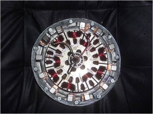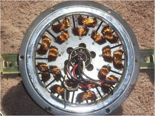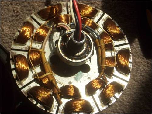arpolis From memory, I think these ceiling fan motors are wound in series, meaning the outside coils are all one wire as well as the inside ones, all another wire. If that was the case when you unwound things, if it were I, I'd wind ONE test coil and spin the thing to see what voltage is produced from just ONE coil and wind accordingly. If it is your intention to make this 2-phase, you may be surprised at how much electricity just one coil makes. I don't think you want a high-voltage, low-amperage machine, but I could be wrong there. At any rate, wind one coil and see what it makes, then multiply that result by the number of coils you intend installing and you can get an idea of the output. Remember too that there are "multipliers" involved, meaning that with "star" connection, there is either a 1.4 or a 1.7 multiplier that comes into play (for 3-phase at least) as well as a 1.4 or a 1.7 multiplier that comes into play for it being a.c. I don't remember which is which, but suffice to say one goes for one and the other for the other. In my little ax-fx build, all I need is 1.8v per coil (9 coils) to reach an ultimate output of something like 13.8 volts (again from memory). Hope this isn't as confusing as I'm thinking it might be, but there are lots of variables building an alternator. If you were to arrange your magnets so that a N passed over the first coil, while a S passed the 2nd and another N were over the 3rd and so on AND you were to wind the consecutive coils alternately say clockwise, then the next one counter-clockwise and all were in series, then each revolution, you would get the voltage of one coil times however many coils are in your array. This adds up fast. I'm building a little iron-cored unit and if my calculations are correct (big if!) I should be able to achieve 14 volts on only 6 coils with a mere 36 winds per coil. Haven't actually tried it yet, but if that's the case, you can bet I'll make the wire size ginormous to lower the coil resistance and garner more current! To clarify that a bit, as magnetic flux travels across windings in a given direction, the current induced travels one way for wires on one side of the coil and the other way for wires on the other side of the same coil. This is what we refer to as "canceling". It's a problem that can be turned into a solution, if you wind things properly. The idea is to have N pass a coil one way while a S passes the same number of turns turned the opposite direction. Doing this creates 2 pulses, each traveling in the same direction down the wire and adding instead of canceling. By alternately using coils wound one way, then the opposite way, then back to the original direction, we can use this phenomena to our advantage. Instead of canceling, the action doubles the output. Make sense? . . . . . . Mac Nothing difficult is ever easy! Perhaps better stated in the words of Morgan Freeman, "Where there is no struggle, there is no progress!" Copeville, Texas |
