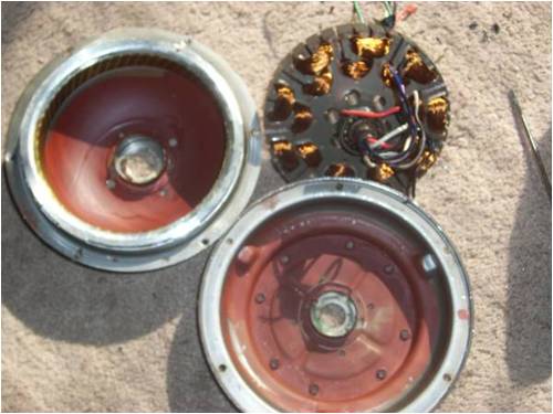 OK here is an update as to where I am in the build and a few Ideas I need to work out. First I have all the copper off of the stator and onto 3 spools as you can see below:
