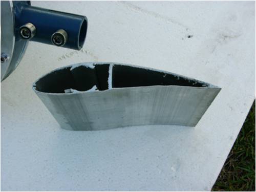 The extruded airfoil section is a high efficiency low speed airfoil with a generous cord for slow speed performance. The blades will be extended to give a larger diameter and hence a larger swept area to optimize the low wind speed performance.