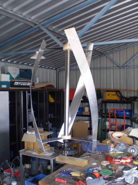 Thanks guys it's not my design entirely , I saw three of these on top of a 6 storey building in the U/K and took some pictures, the actual ones at a guess were about 3metres high. The stator on there at the moment is wired for 24v low wind, until I know how it performs I can't decide. Hope to have it going at ground level next weekend for trials. jasmine |