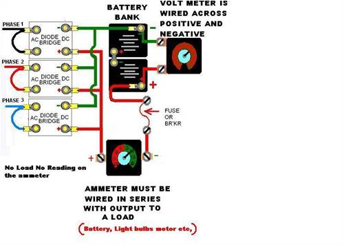 Shelly; -A couple of thoughts come to mind, #1 are you certain your diodes are not damaged? they could be shorted internally rather than open. As Gordon has noted, if there is no load the ammeter will show nothing. #2 Is the ammeter connected in series with your Load? Here is a modified old post of mine showing my thoughts on a proper hookup. Time has proven that I am blind to the Obvious, some of the above may be True? |