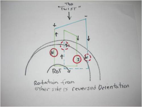 Note the little arrows and the direction of rotation. The current induced in each segment of the same conductor (coil) travels in the same direction as the others, thus no "cancellation". That little sign at the top, which says, "The Twist" was in lieu of a 'hint' given a couple people to see if they could come up with what I did without me actually spilling the beans.