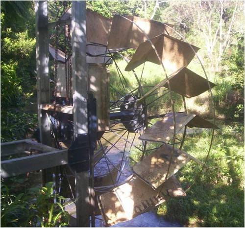 4th photo, wheel in action, you can see the hinges where it swings from this position, also small wall in creek to channel water. The creek is slightly higher than normal in this photo but wheel can be lowered to adapt to the flow.