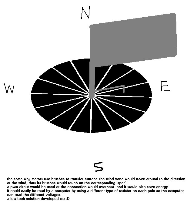 Hi all, Am new to the windmill stuff but have made a bit of stuff over last 2 weeks. have started on a couple of the F&P willmind brackets and just made a little bike computer anemometer to start trying to pick out a site for the mill. Am wondering if someone has an idea or knows of a simple way to monitor the wind direction so that it could be read on a computer or uC. Was thinking maybe of an encoder wheel and some leds on a windvane to send a simple binary number for a microcontroller to read. Any other suggestions as the leds will need power? , maybe just a ring of reed switches and a magnet on the vane. |