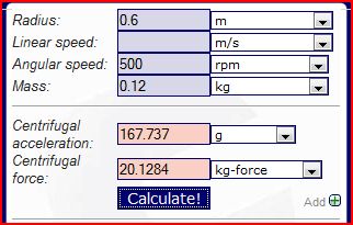 Out of curiosity i went looking for a calculator for centrifugal force and found this handy one.