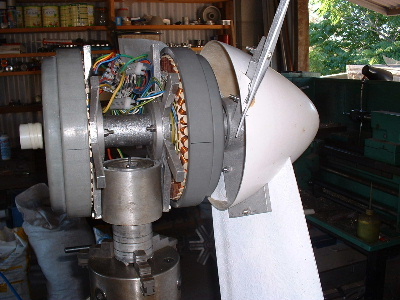Yes the spline was drilled out and you can just make out the keyway in the top picture this weakened the plastic magnet hub and they arent that strong to start with but cost peanuts and i have heaps, none have broken yet !! but if you have the gear to extended the original spline or bought one it could be stronger. and the arm coming out can be adjusted so the offset from the mast is adjustable so once tail is made and angles are welded you can play with furling untill happy. (I AM THE KING OF COPYING GOOD IDEARS) that others slaved over for hours and hours. O buy the way i forgot the original alloy housing has a little you have to take off it held a seal that is not needed. After burning plastic off its easy to see were to cut i used a hand held 9 inch grinder with a cuting weel on easy as pie. remember the stators are snug up to the berings so they line up perfectly |