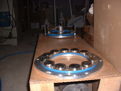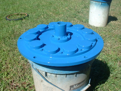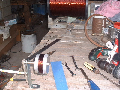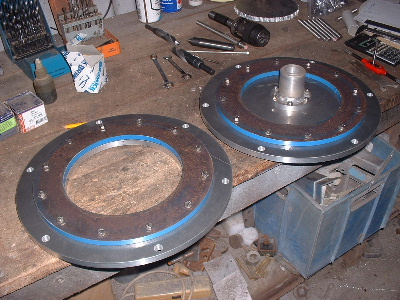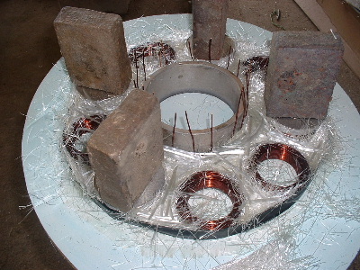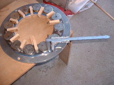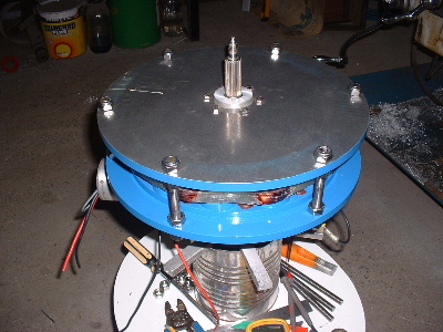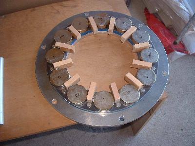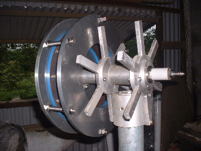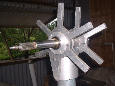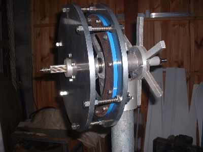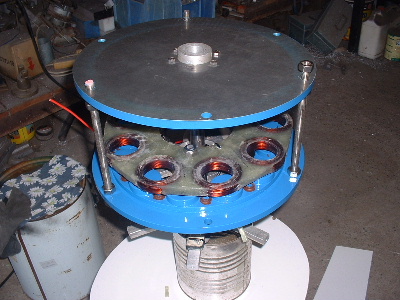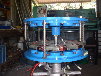 No worries Mac, you are allowed to get old. Good info though for somebody who don't know. Thanks Pete. I don't need to say any more. But sombody may want to know. The magnets are N50M, 50mm round x 12mm thick. Coils are 48mm ID and the OD is about 72-74mm. The coils have 100 turns of 1.25mm2 wire. Coils are equaly spaced as are the magnets equaly spaced. The centre of the magnets and coils is a diameter of 246mm. And yes,the 3:4 ratio is the critical bit. Temporary fit the stator to check where to run the wires out and then finish this off. Assembled the AXFX unit and discovered I did need the spacer I made after all, so pulled apart and put in the spacer and machined the front of the rotor hub so the blades would still go on. The jacking bolts are 200mm long and there was no significant magnetic pull at that distance apart. Any how here is a few pictures. Preliminary spin and yes voltage does occur. Details later after I test properly. Trev @ drivebynature.com |