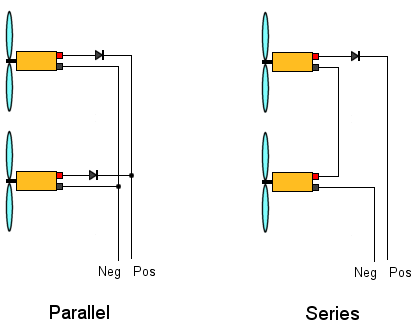 In a parallel set up, which sounds like your existing set up, you would need two blocking diodes, one for each motor. For a series set up, only one would be needed. A blocking diode drops approx 0.6 volts, so the less diodes in series the better.