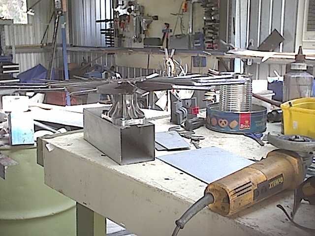 Whilst walking the dog today I came across a house with some water pumping mills for sale out the front, one was probably 8ft tall with a rotor around 1.5m and a few other smaller ones, all very detailed reproductions of the big farm type mills like loyds, being the inquisitive type I enquired into who made them and generally chatted with the owner explaining to him that I was also very interested in wind power engineering. I was invited into his workshop where he was ballancing his latest rotor (he had already constructed the 4 leg tower complete with a mini ladder etc..) while I told him about your site I also noticed a new system he was beginning to use that saved him alot of time making bearing assemblies from scratch, he uses a water pump from a holden rodeo, I asked him if it had bearings at the front and the back to support the gyro loads, it did although I don't know what it could handle. He didn't mind if I took a pic so what do you think?..... |