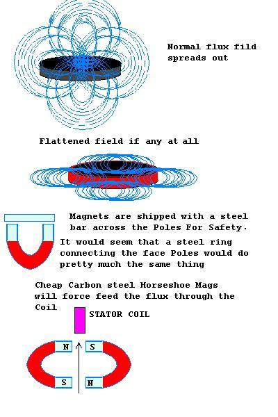 The magnets in this case are half an axial-flux wheel. That means the magnets are arranged alternately N and S on the wheel, with a backing plate tying all their back sides. Their front sides must "bridge" to one another. By running this up close to the magnetite-infused stator, those lines of flux have a better return path to each other and thus will produce more electricity than if they were to jump the air gap on their own.