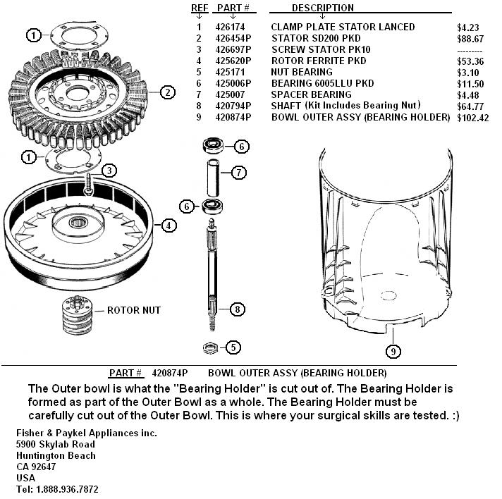 I found a F&P parts place in California USA, if anyone needs the info here it is with part #s. I believe the part #s have changed for the new Stator and Rotor and are reflected in the pic below.