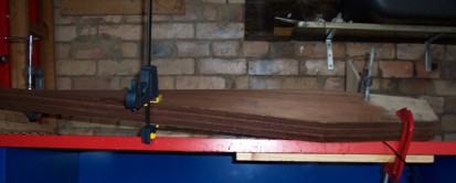 I then left them to soak in a wheelie bin full of water for three weeks. I made a jig on a bench to clamp them to, clamped them in and left to dry, so far about 4 weeks drying.