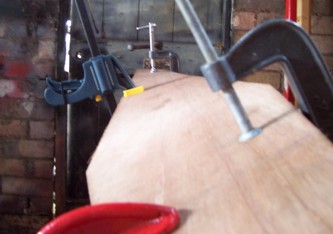 They did lose a bit of their twist after the carving of the aerofoil shape was done. The wood which was removed must have been holding some of the twist. It would be better to cut the shape out, carve and then soak and twist. But if you do this you can't stack the blades on top of each other when clamping, due to the wing shape on the blades. So three separate jigs will need to be made for them to dry out in.