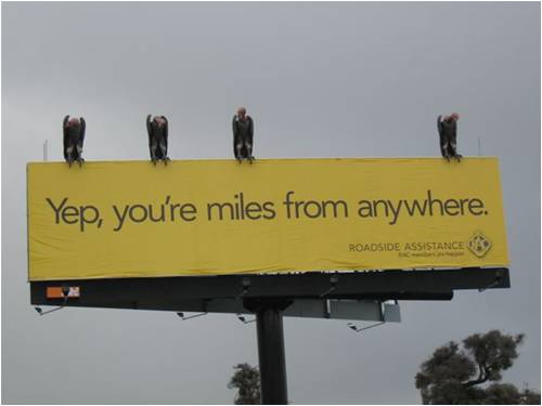 It is rather clever to associate the vultures with the fact that "you are at risk...". Personally, I believe that large signs or objects that may take your attention away from driving is not good for road safety.