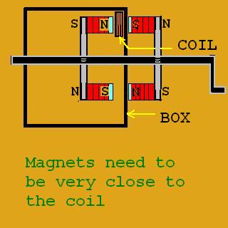 The magnetic flux has to pass thorough the coil in one direction and then the other, and this change has to take place rapidly. It's like links of a chain except that the links pass through each other to produce voltage. The above if it works is a picture of a simplistic configuration. Most are more complicated but they are designed to achieve the same thing. Hugh Piggott |