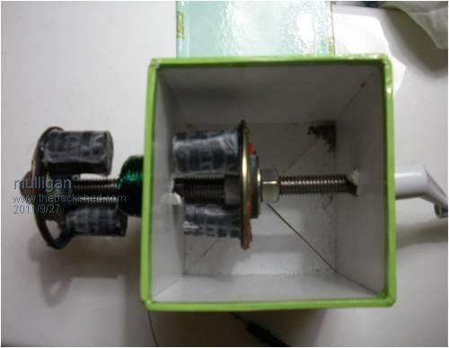 The coil is fixed to the outside of the cardboard box and DOESN'T rotate when the threaded bar is rotated. I essentially used the box as the stator. |