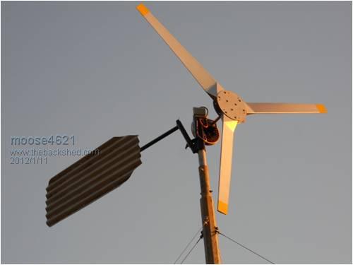 I was thinking of putting a latching 3 phase contactor between the wind turbine and the rectifier to short the alternator at full charge. It sounds like a "diversion" controller is the go. I didn't know there was such a thing. I have played a little by momentarily zapping 12v across one of the phases during a light breeze and if the conditions are right, (and I pick the right phase), the prop will rotate enough to start and then keep running until the breeze drops off again. That's what makes me think about a controller, ie arduino, connected to a wind speed input device that can shove a few seconds of 3phase motor drive up the line when the conditions are right. Something I might play with if I get time. Mean while, I took a couple of shot this evening to decorate this post with as I kow how much I like to see pickies. The size of the tail is another concern of mine. It was sized according to Hugh Piggot's book but I see most of you guy's have much smaller tails. He who dies with the most toys, wins! |