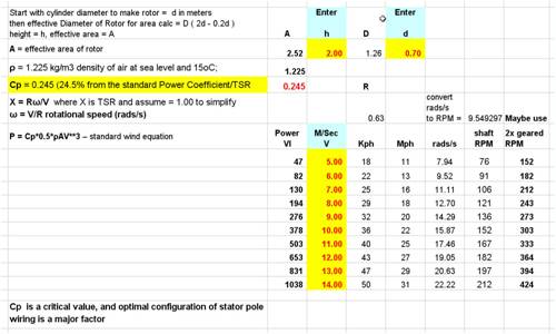 Thanks for the interesting comments. I recognise that VAWTs can never be as efficient as HAWTs, however I am looking for a starter project for a "Men's shed" which is starting here in Moss Vale NSW. The relative simplicity means that a working example can be created and get ideas and enthusiasm flowing. I knocked up a simple spreadsheet ( with some assumptions ) which, I think, support a dual F&P .6mm gen setup ( overkill, yes but I have two motors ) The fun bit will be experimenting with pole mix & matching, I am thinking of setting up a test rig to evaluate the stator config - again an activity which should get some chaps in the men's shed going. Here is a snapshot of my spreadsheet for a particular sized VAWT.