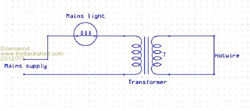A simple hotwire cutter i have made that works reasonably well for how simple it is follows below. You need a transformer of around 2 amp output capacity (or greater), the output voltage is not 100% important but think mine was about 24 volt. A standard household light globe is fitted in series with one of the mains supply wires, this works as a current limiter to the transformer to prevent it burning up, because the secondary side of the transformer has a dead short across it being the hot wire. The light globe can be changed to adjust the wire temperature..... a 25 watt globe will give a hotter wire than a 100 watt globe will. The hot wire is connected as a dead short across the output of the transformer. (secondary side) I used some 0.6 mig welding wire, but piano wire would work better, you need a wire with some strength or you will snap it frequently. Also the wire needs to be left long and coiled up one end for spare replacement, as it will break, then you can just slide a few inches through, lock it in place and back to work. I would do the wire as a bench mounted frame and feed the foam through it like a bandsaw, as opposed to a hand held bowsaw arrangement. All said i think you would be foolish to try to fly foam blades without a fiberglass skin over them. That causes problem number 2, the type of foam you use, as not all foams are suitable to fiberglass. Pete. Sometimes it just works |