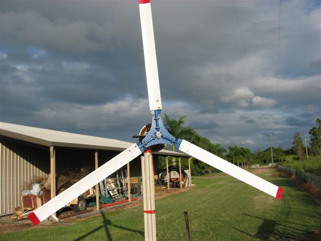 OK here's the latest, plus some photos. Again, in Davids words.... "Hi Glenn, I will just ramble on and list it as it comes into my head. Observations to date: Your blades have been up 6 days now Noise levels are a little high. at higher revs the whistle gets higher pitched and can be heard many many metres away Still some of the whine is the turbine as I don’t get it on the F & P with Chinese blades. The reshaping definitely requires a much higher starting speed. However the start up speed here is still acceptable for me. We get wind virtually every day from 10 am till 6 pm and quite gusty. With the original standard Chinese blades and the Chinese controller I have seen the amps stay between 4-8 and peak burst up to 18-20 amps Now for the good news: After about 10 in the morning the output with your blades shows 6-12 amp and quite often bursts up to 24 and I have even seen the amps go of the scale at 30 amps………The high end improvement is dramatic!!!!!!!!!!!!! (if only we could get the noise down) This makes my 200w mill a great little beast. Have ordered from Trev a tristar 60 amp controller with display and data logging. massive overkill but what hell its cheaper than a set of golf clubs. That should be here by the end of the week. So I can continue with the f & P s. Just as you said one bar the hub extender needed packing (about 30 mm out at the tip…. When I finish I will mark that one on the hub and maybe you can give it a tweak. With standard Chinese blades at 2.5 m diameter and a 5 degree angle of attack the start up is very very poor (decogged 8sp star 12volt) However if you increase it to 10-12 degrees the start up is reasonable but the output is poor as I can’t seem to get enough speed for a good output I have to say so far that the Chinese mill works much better than an f & P (going by the number of people who rave over them I must be doing something wrong) Next month will probably convert to 7 pole cogless and see if I can get these to go. If you wish to put anything about this testing in you diary forum can you put in my own email warrendj@bigpond.net.au and say if there is anybody in Townsville who would like to see your blades and hub they can contact me and am happy to have them come round" So there you go. As David said, if anyone is in the Townsville area they can drop him an email to plan a visit. Looks like the blade modification only helped noise at low RPM, but has given some real gain at high RPM. Davids 200 watt windmill is making over 360 watts.