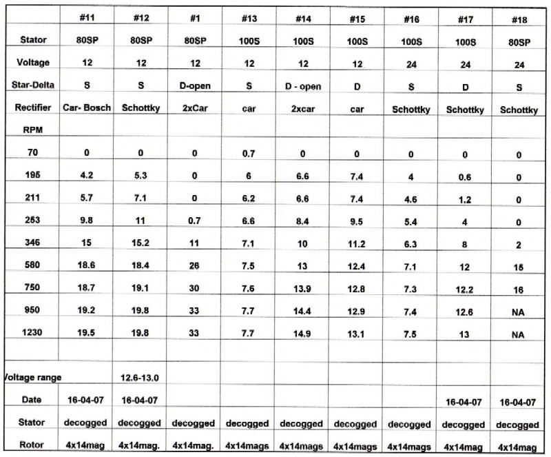 The output of the 80SP-star one phase disconnected from the rectifier was reduced by 50%: @1200rpm 11amps.