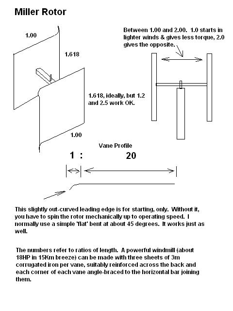 Some few years ago I was involved in helping people understand 'Miller Rotor' windmills which are a very powerful, 'torquey', non-aerodynamic way of extracting power from the wind. (Think: Holding a sheet of roofing iron and a wind blows up suddenly.) I was surprised to learn that no one on your forum had ever mentioned them. Miller was an elderly gent with an inventive bent who wanted to leave something to posterity of his own devising. He developed the Miller Rotor in conjunction with (I think) the Ballarat Tech, School some dedades ago, but died before he could complete all his research. The Tech published his incomplete work afterwards. I did a lot of models and few larger ones to determine what the optimum ratio of dimensions for the blades should be. People around here got used to 'that funny fella' driving around with outlandish contraptions strapped on the back of his ute when I was testing different ideas. What I came up with, finally, was a ratio of about 1:1.6. A sudden flash of inspiration made me realise that it should probably be the 'Golden Mean' of 1.618. I tried it and it WAS the optimum! Anyway, attached are a few pictures that should help you get started on this uniquely Australian invention. Yell out if you need help. Words of Warning ... These rotors are unbelievably powerful and will quite happily take off an arm, a head, etc. They have one saving grace, however, they always turn a quarter-turn backwards before they take off reaching full torque in one revolution or less. The bad news is, they start in very light airs (less than 1M/S)