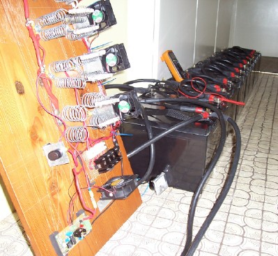The large 15Kw load bank on the left is rated at 150v 100 amps and I bought it from a secondhand machinery graveyard. I actually have two of these. By tapping off various sections, it is a very handy thing to have for testing at high power. My most useful loads are banks of thirty two 240v and 110v radiator bars. I purchased just the bare radiator bars themselves from a company that makes them. There are 32 bars in each load bank, and they are switched in and out with mosfets run from a microcontroller. These radiator bar loads are now at least twenty years old, and I cannot remember where I originally bought the radiator bars from. But a search through the telephone book should find you a source of something similar. I also have a selection of ordinary wire wound resistors, including a very useful laboratory slider type. Similar stuff occasionally surfaces on e-bay, you just need to keep an eye open, and grab whatever shows up. These loads are very rarely used, but are extremely convenient to have when needed. Cheers, Tony. |