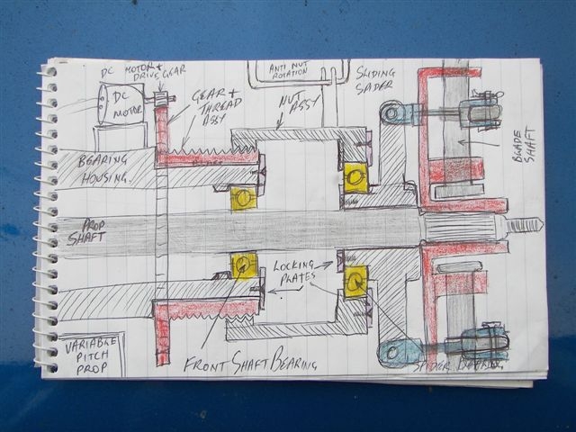Meanwhile, here is my concept for the most simple variable prop system, I trust the diagram is self explanatory. Uses a clutch thrust bearing etc.