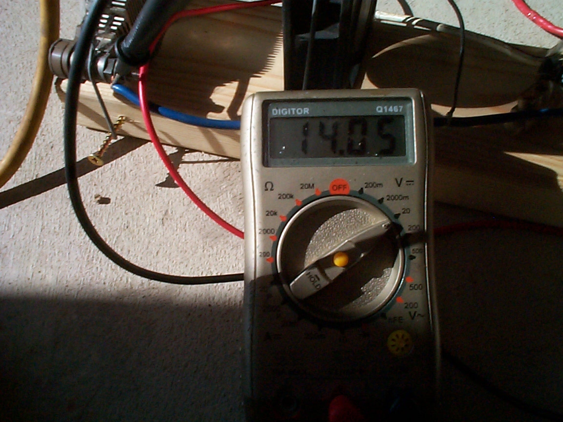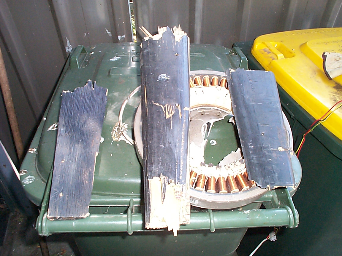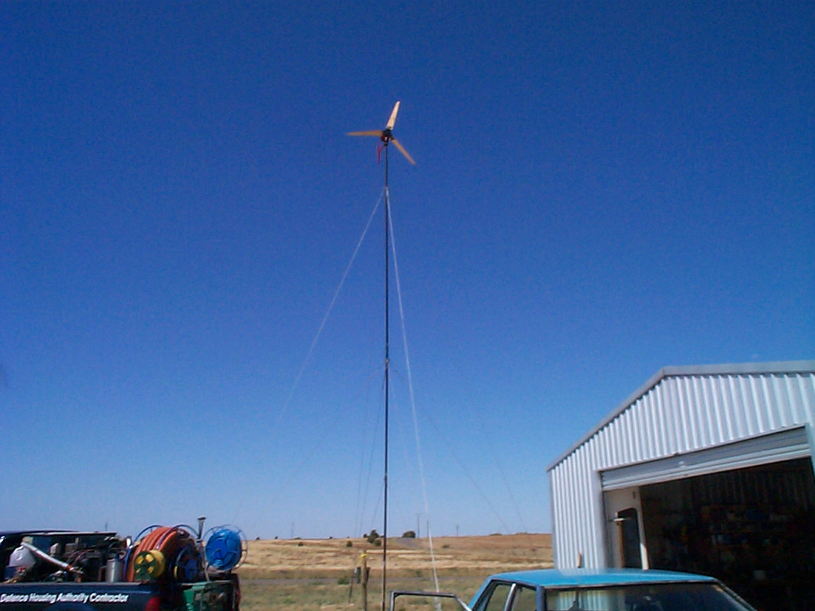 The problem with the windmill was a bushing problem with the shaft. Gizmo has a bearing locked in place by 2 grub screws ( refer diy windmills kit assembly ) in an 56205 bearing holder, i opted for a slightly different setup and the actual hub floated in on the shaft and the blades struck the tower with such a crash that the unit fractured. The wind at the time was very fast, i have very high winds here in Murray Bridge. Eco Inn will tell you that the F & P will go up to 1800 revs before it gets hot and goes out of balance, i doubt very much that the unit got any where near those revs ,BUT i only used the ply prop blades  ( 2 x 18mm very light ply x 1000mm )  and this may have been a problem strength wise but if a blade hits the tower its history. The new tower and windmill went up today an F & P in star and instantly put out 14.20 volts, this one also has the prop blades but out of stronger material. Each blade is 1200mm long and seem to be working well here are a couple of photos, im playing god with this one as it is not a furling system, i have a serious storm on the way tommorow so it is currently braked by shorting the phases out.