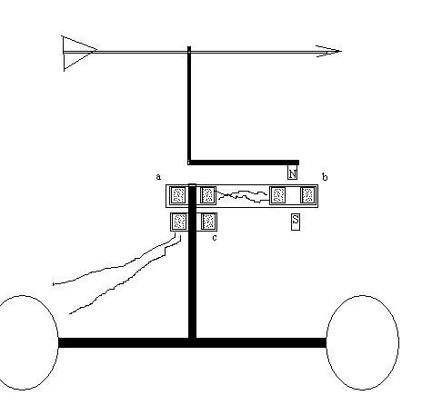 The easiest way to get an anemometer nowadays is probably to pay a call to your favourite electronics shop and by one. But for those who like to actually make stuff an anemometer can be quite a challenge, especially if you want to include speed and direction, want to avoid slip rings and you dont want half a dozen wires. So here is my concept for a wind speed and direction sensor using only two wires and no inscrutable electronics. The direction vane and the speed cups are mounted on a common axis. An arm on the shaft of the speed cups carries two coils connected together, coil 'b' has a voltage induced in it every time it whirls by magnet 'N' which is attached to the direction vane, it also passes magnet 'S' which is in a fixed position. So for every rotation of the speed cups there will be two pulses, one positive and one negative. For example we will say the positive pulses result from passing the fixed magnet and obviously the number of pulses per second gives us the wind speed. The negative pulses will be at some time depending upon the position of the direction vane, so the position of this pulse in relation to the first gives us the direction of the wind. Coil 'b' is connected to coil 'a' which is magnetically coupled to fixed postion coil 'c'. A PC sound card would probably make an easy project of processing these pulses to give both speed and direction. Well, there it is, my idea though I have never made one!