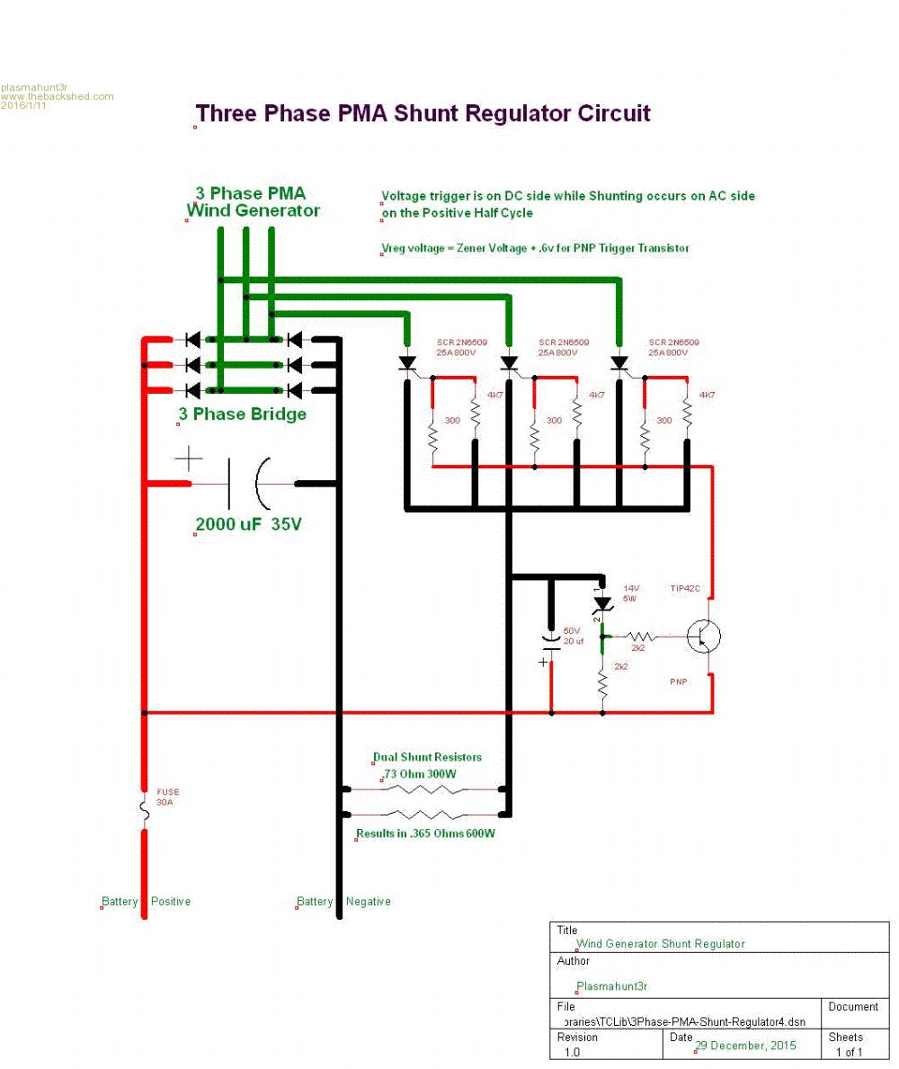 I have built and tested a 3 phase Shunt Regulator for my 12v Wind Turbine. I wanted to get this circuit out there for others who like to build their own. This circuit can be modified for 24v and 48V Turbines by changing the Zener and appropriate capacitor values.